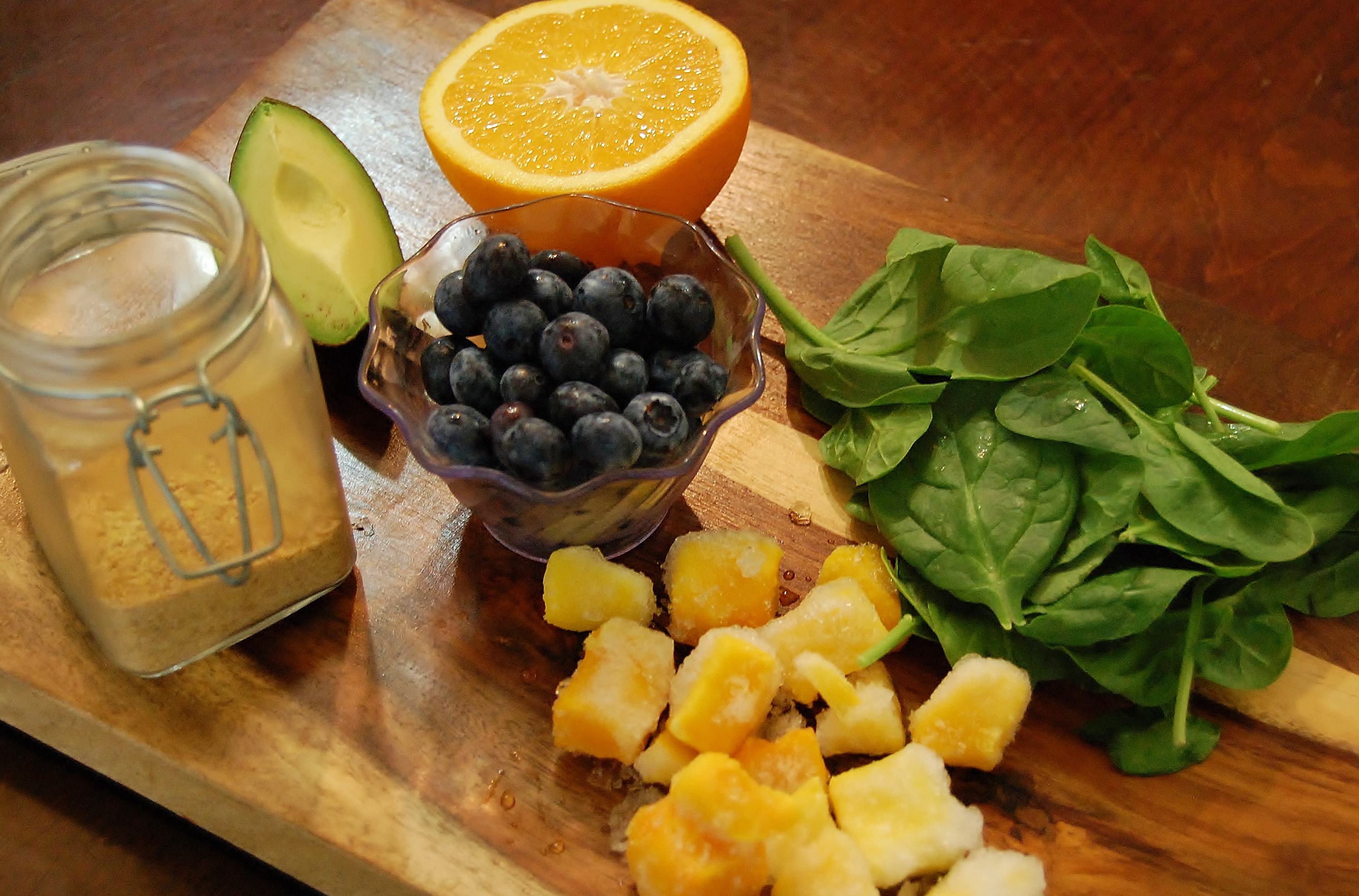 - Place the ingredients in a blender (spinach first), except for the orange.