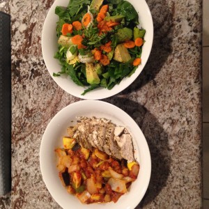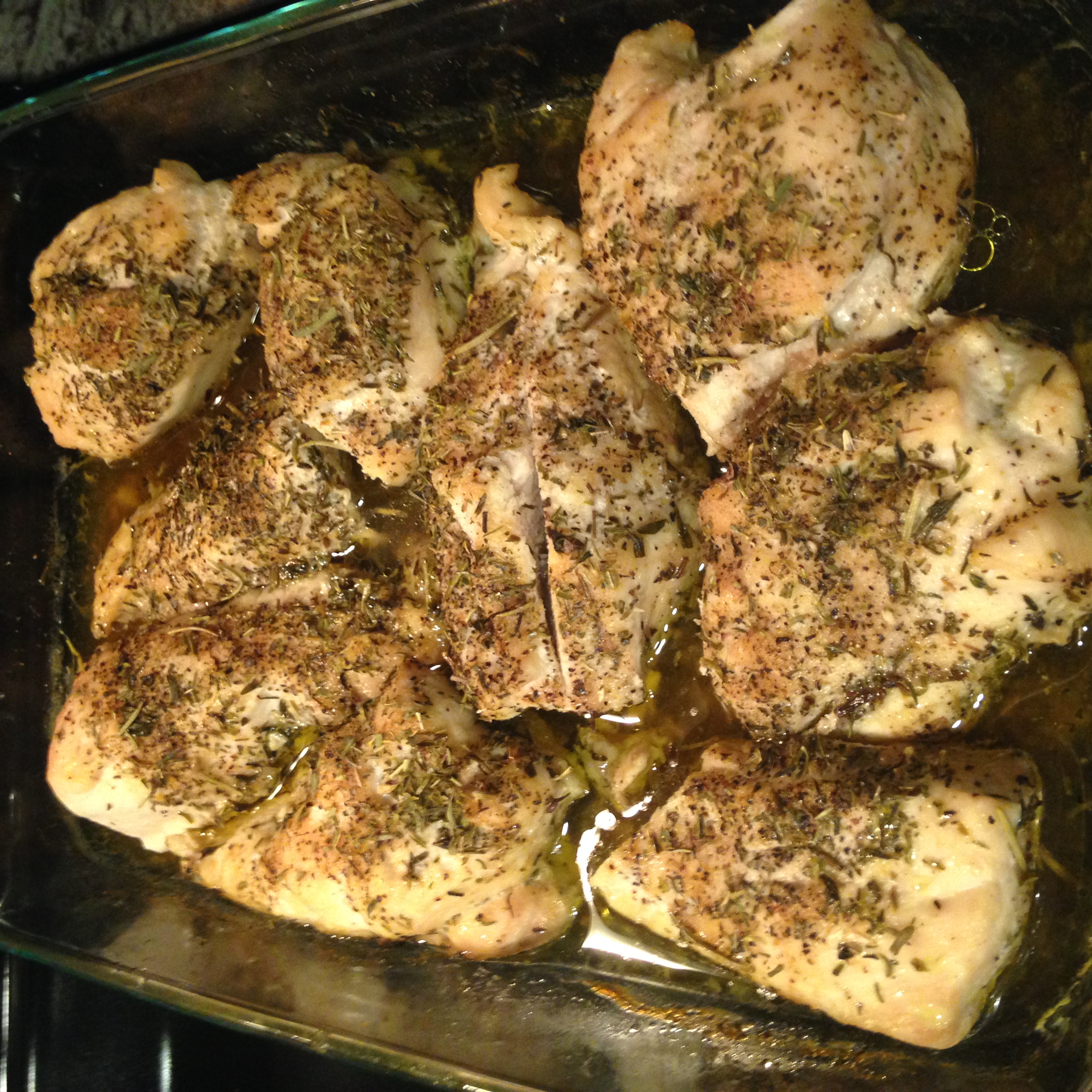 1. For the chicken – wash and clean chicken breasts. Placing all chicken in a large baking pan. I use a large glass Pyrex pan and season in the pan with olive oil, garlic powder and salt free herbes de provence, pinch of salt and pepper. Be sure to season both sides of the chicken. Then, cook in a 375 degree oven for about 20 minutes.
