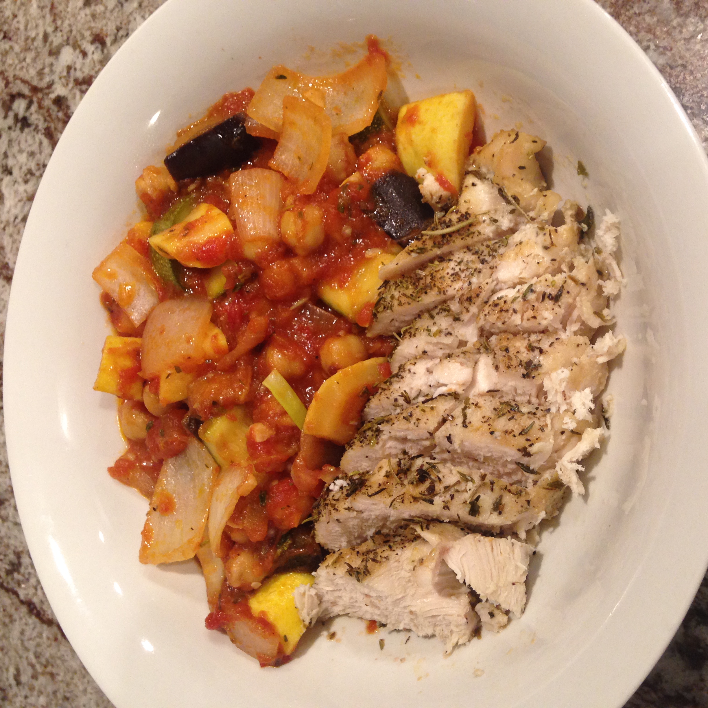 4. Serve individually with the chicken breast on the bottom and ratatouille spooned on top