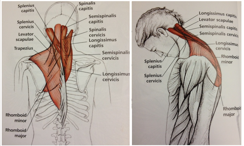 - look over shoulder (to the right/left) – Stretches the upper traps, and deep into the levitator scapulae