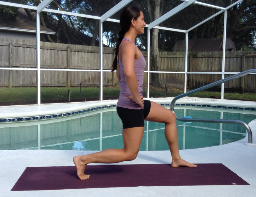 The lunge targets the butt and the tops of the thigh (quadtriceps). See video for instruction…just remember don’t let your knee hit the ground.