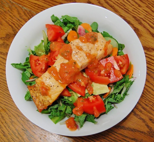 • Top the salad bases with one salmon filet and ¼ an avocado. Sprinkle liberally with freshly cracked black pepper and with a serving of the Tomato Basil Vinaigrette.