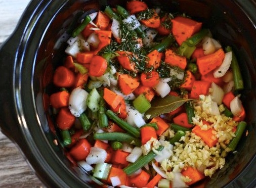Combine all ingredients in a slow cooker. Turn heat on low and cook for 10 hours, adding a little extra of the low sodium vegetable broth at the end if soup seems too thick.